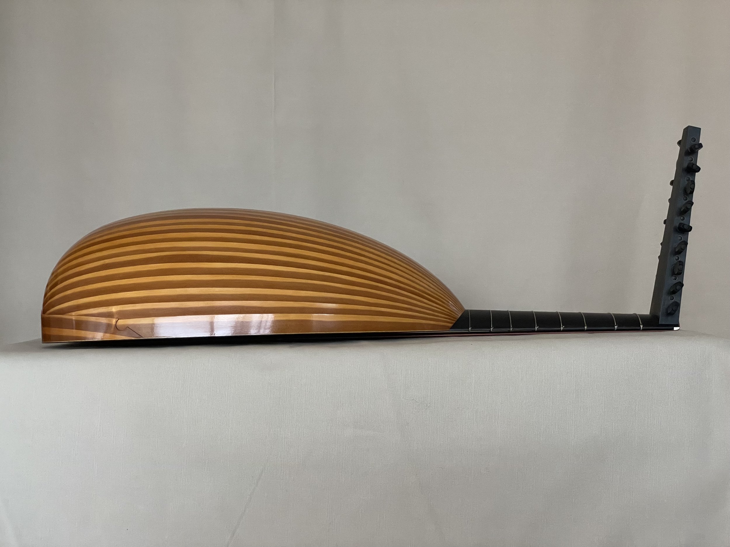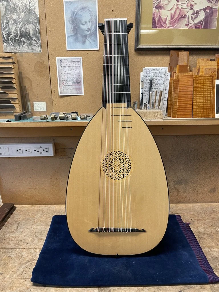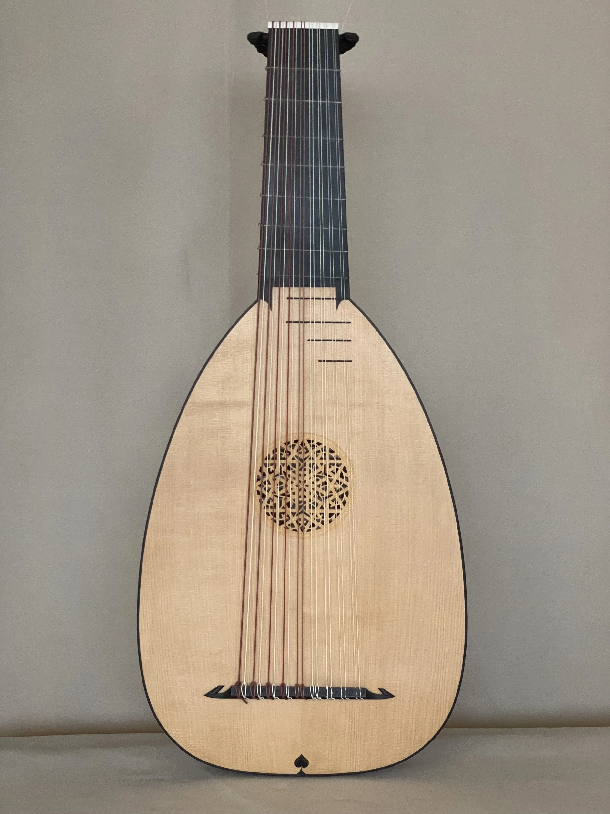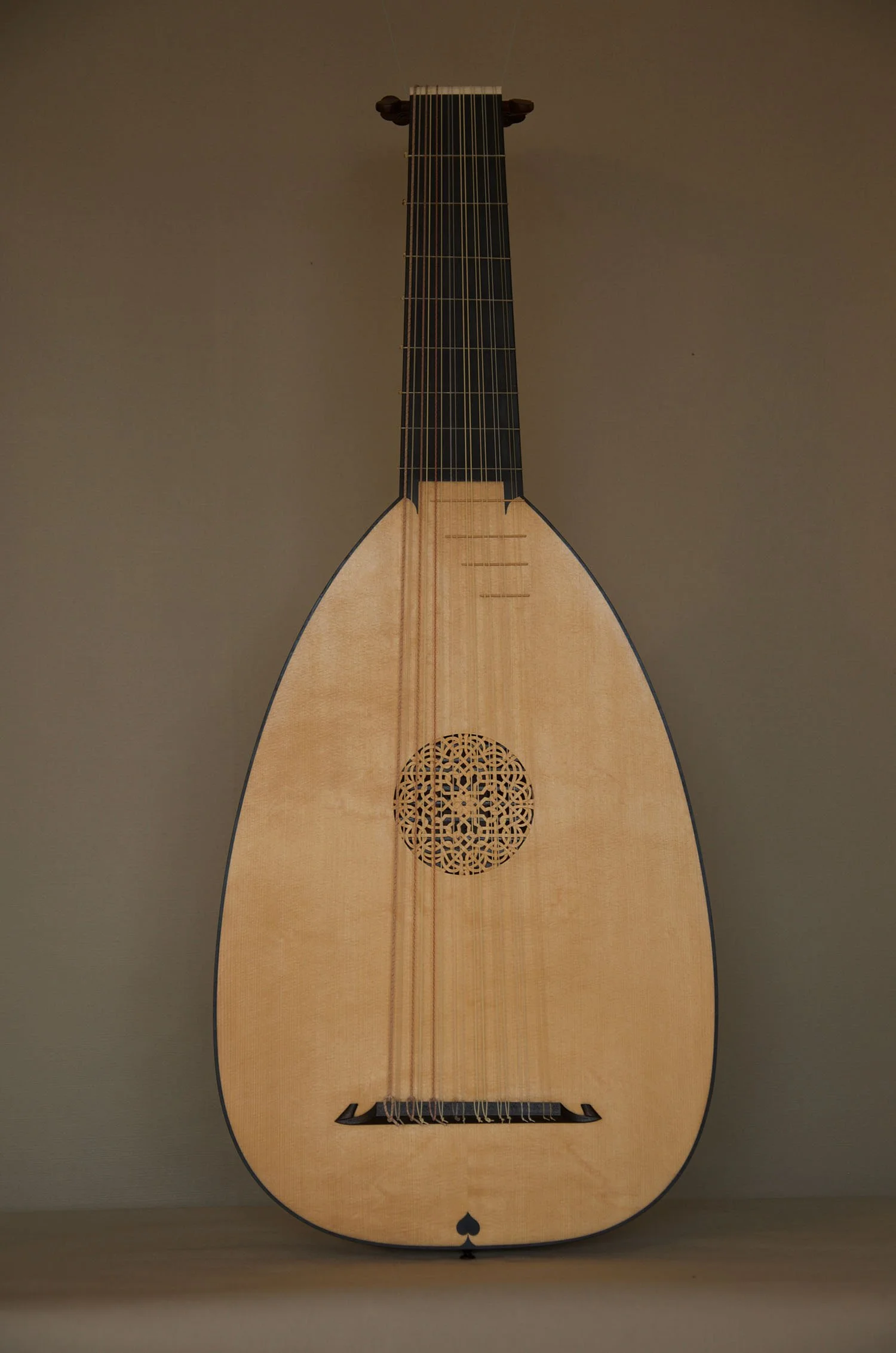 Based on a multi-ribbed yew lute by Vendelinus Tieffenbruker, which was converted to a 13 course lute by Thomas Edlinger in 1724, located in the National Music Museum in Vermillion, South Dakota (NMM 10214).