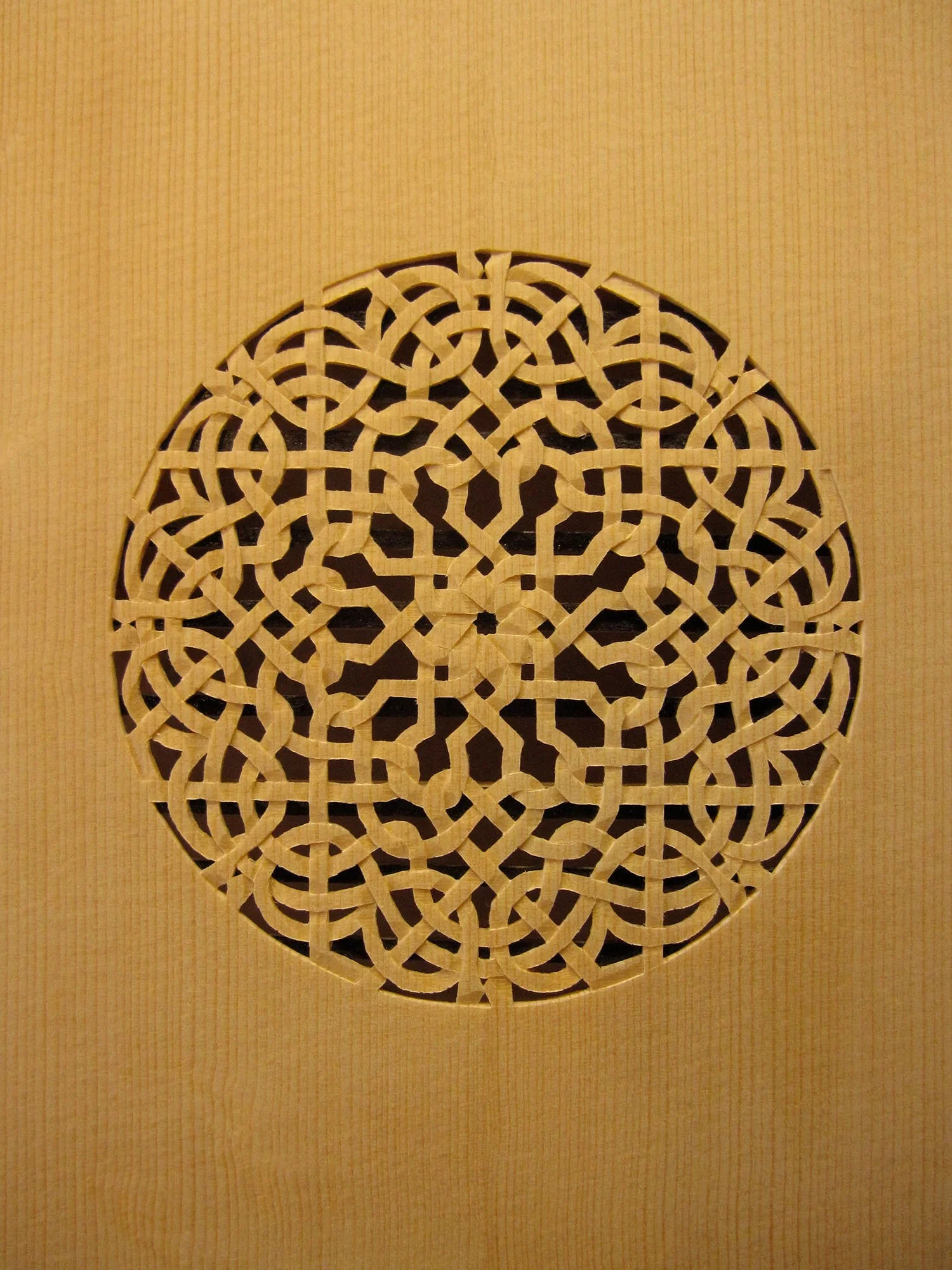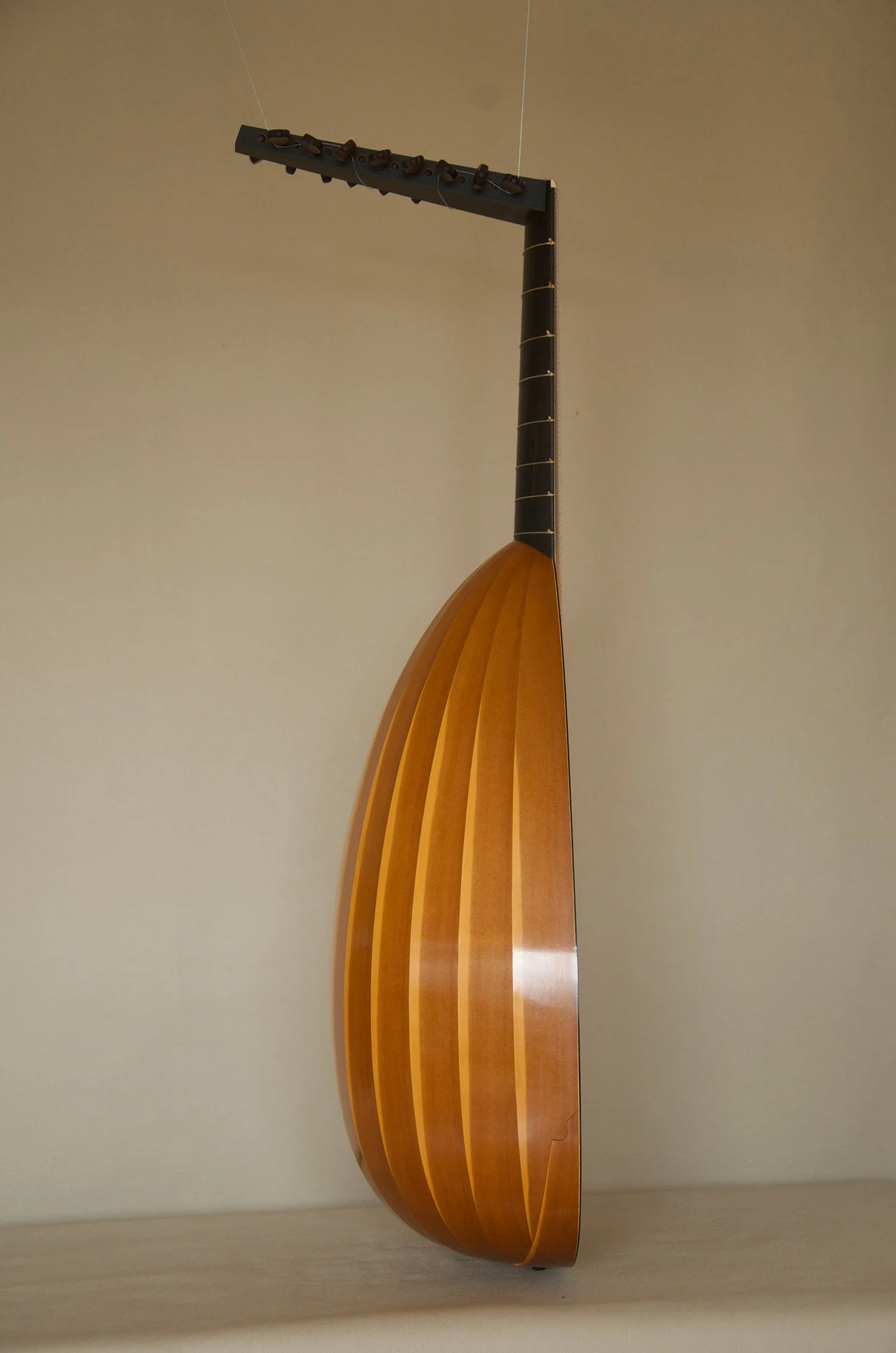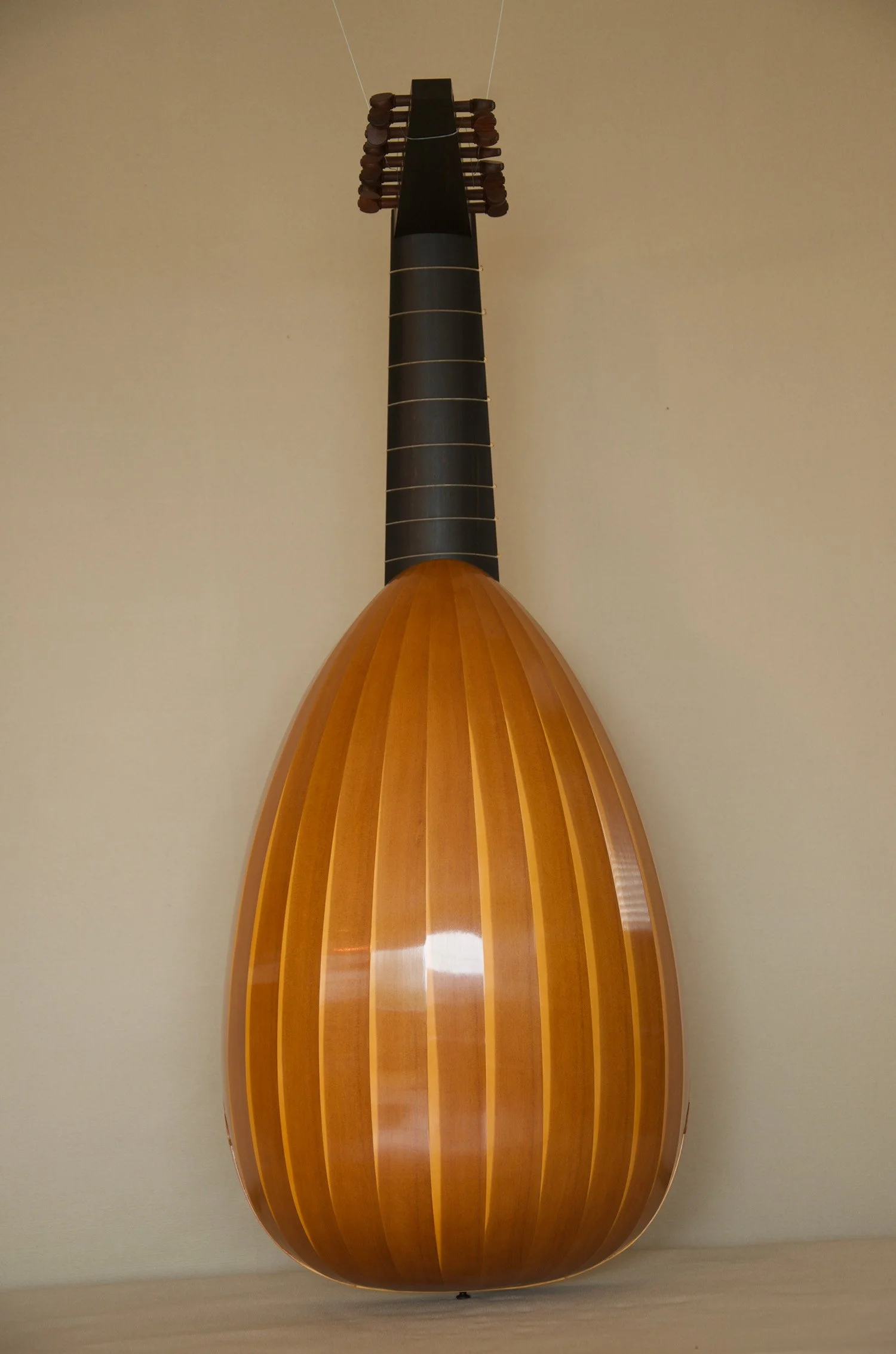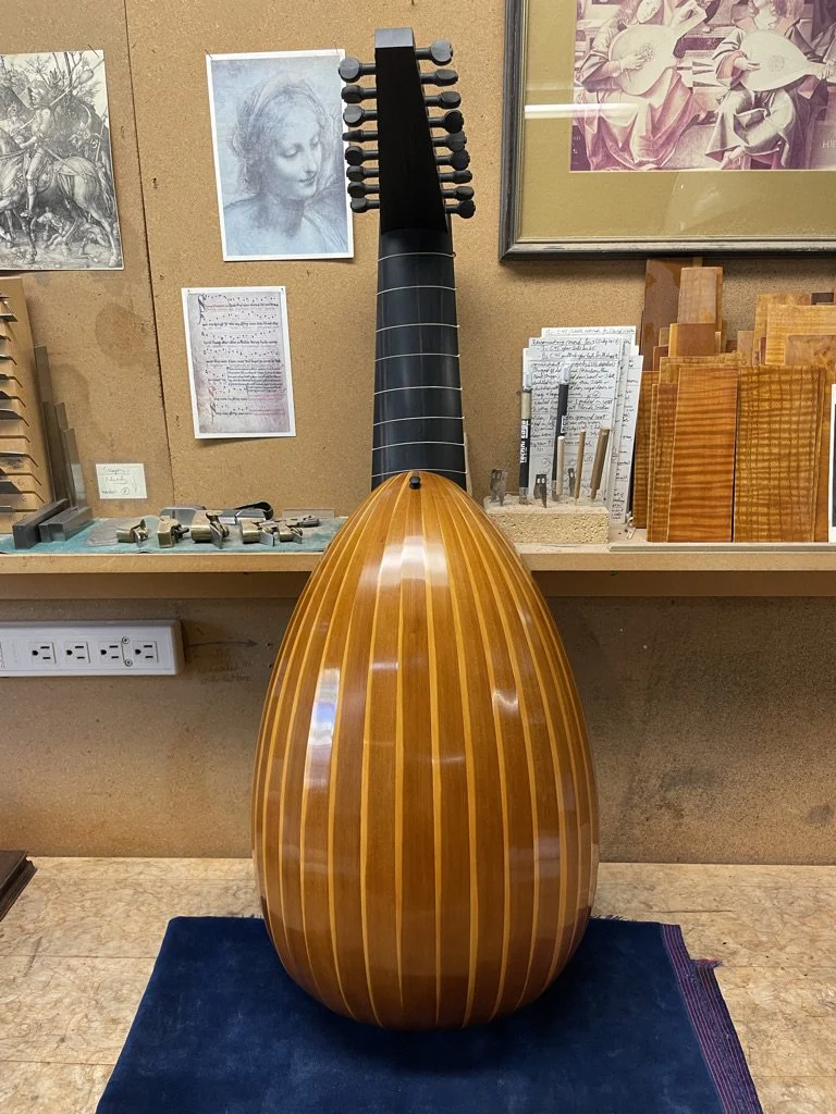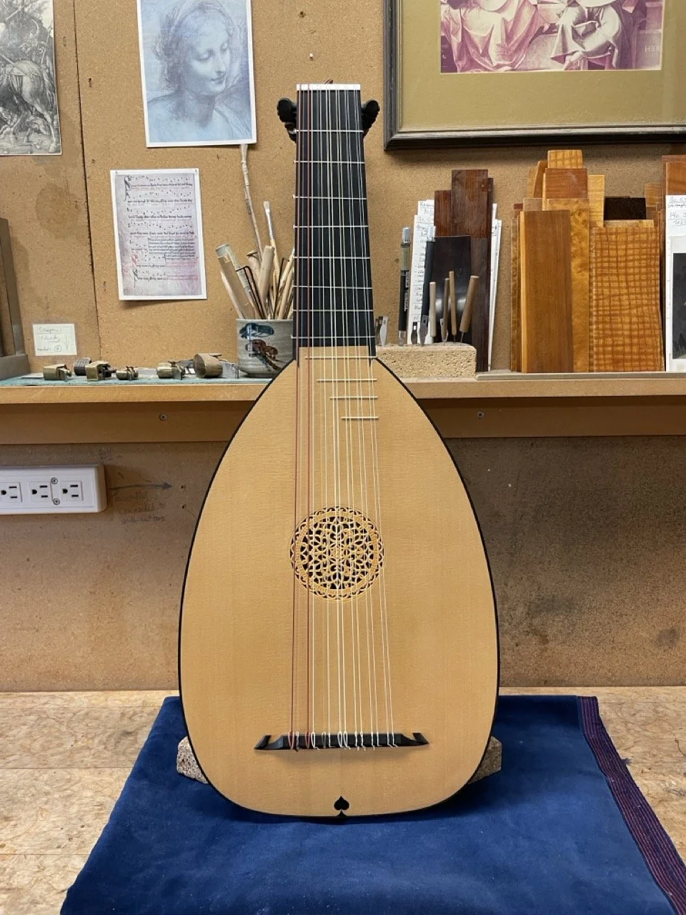 Based on a multi-ribbed yew lute by Vendelinus Tieffenbruker, which was converted to a 13 course lute by Thomas Edlinger in 1724, located in the National Music Museum in Vermillion, South Dakota (NMM 10214).
