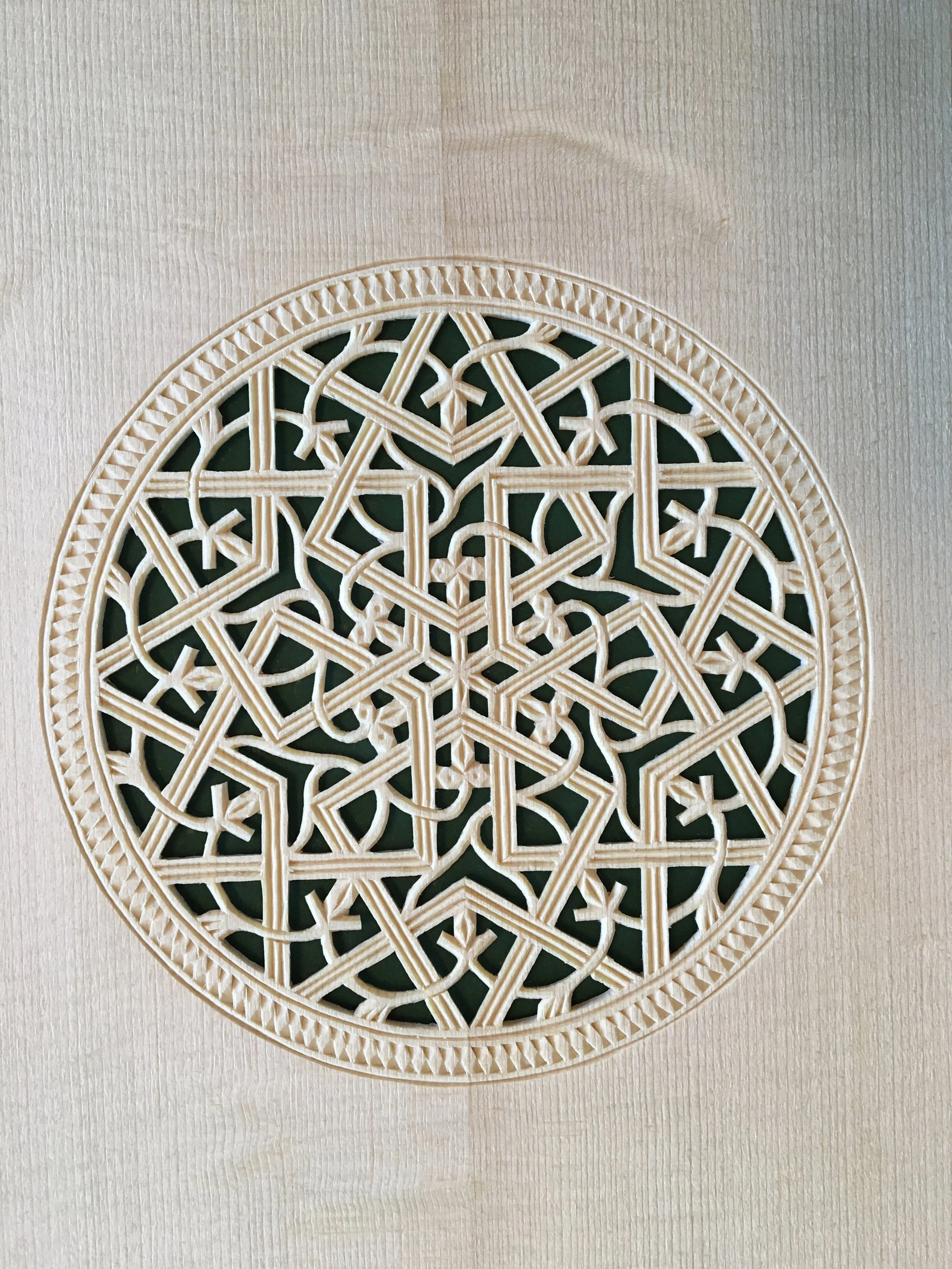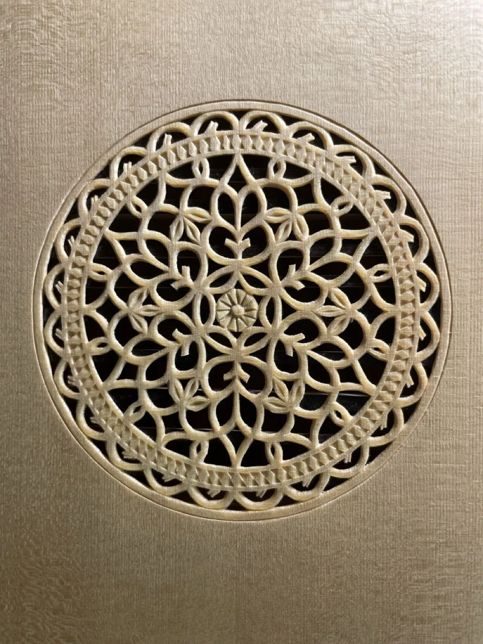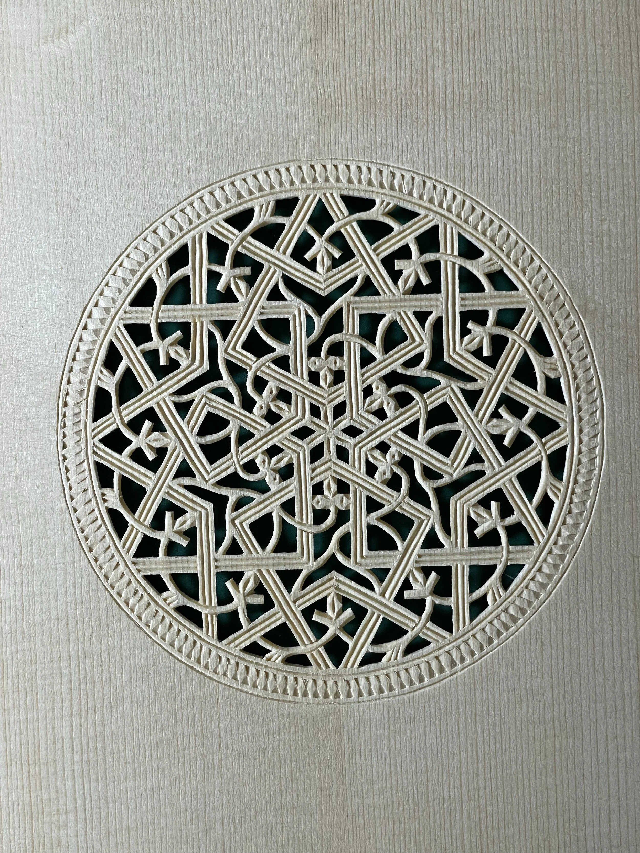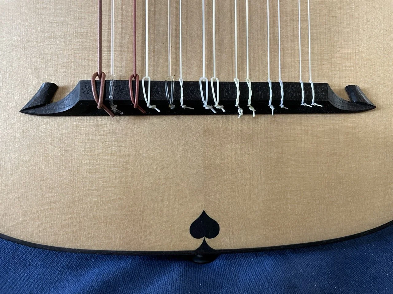 My version of this lute may have the back constructed with 25 dark yew ribs with sycamore spacers (as the original), or with 25 striped yew ribs. The neck and peg-box are veneered with ebony. Fingerboard, points and edge binding of ebony. Decorative knot carved within the rose pattern, inlaid ebony heart below the bridge.