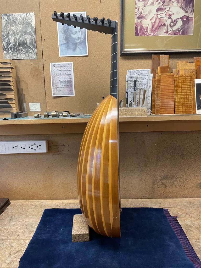 I build the back of this instrument with either 13 curly maple ribs with black-dyed poplar spacers (as the original) or, in a more typical fashion of c.1580-90, with 13 striped yew ribs or 13 dark yew ribs with sycamore spacers. My unveneered version of this lute has a pear neck and peg-box, and the veneered version has ebony veneers on the neck and peg-box. Both unveneered and veneered instruments may be ordered with either curly maple or yew backs. Both versions have an ebony fingerboard, points and edge binding.