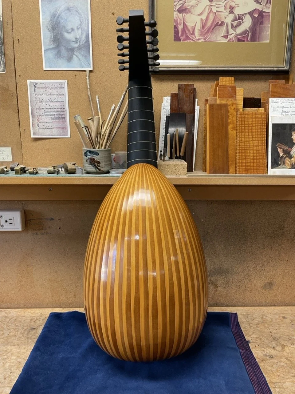 Based on the body of an archlute by Magno dieffopruchar, Venice c. 1615, in the Vienna Kunsthistorischesmuseum (C45). I have reduced the number of ribs on the back from the original 31 striped yew to 17 (following the example of several Paduan lutes built in the late 1580's).
